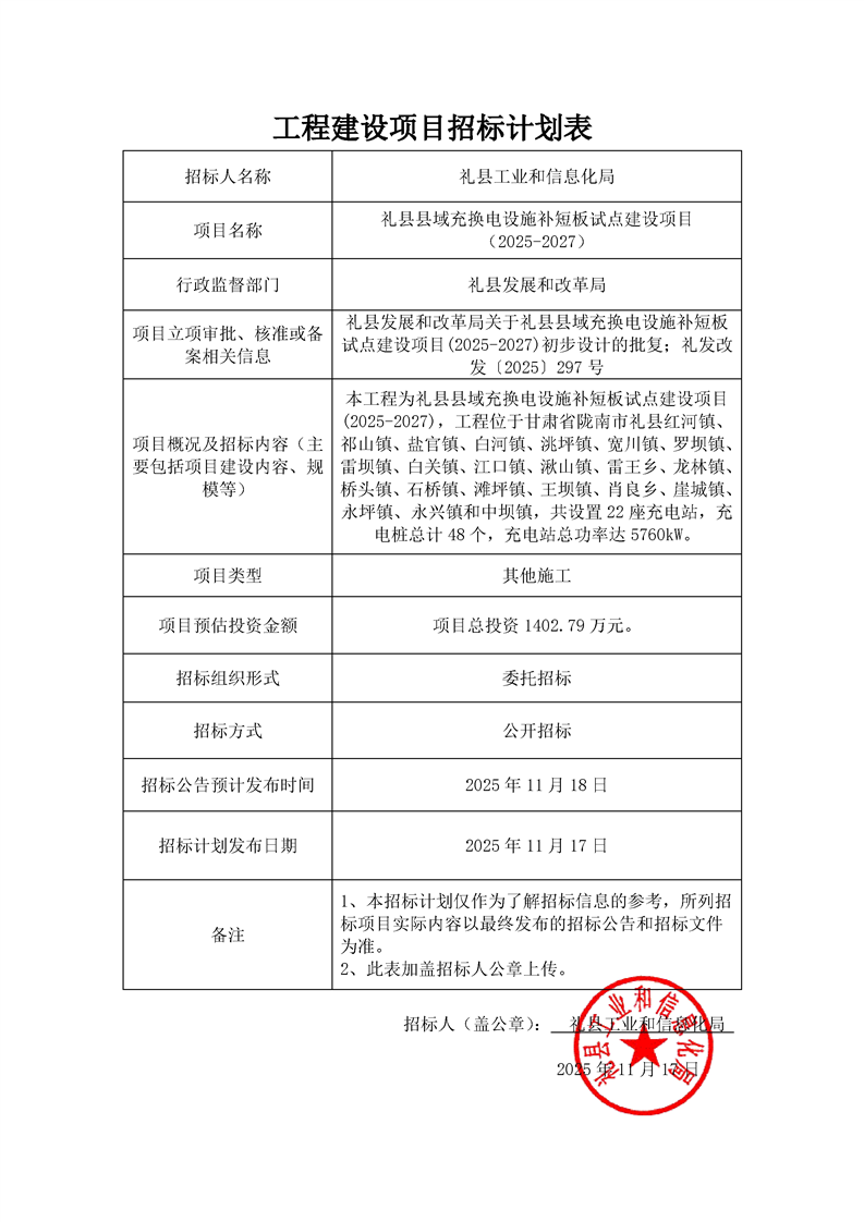 招標計劃—禮縣縣域充換電設(shè)施補短板試點建設(shè)項目(2025-2027).pdf