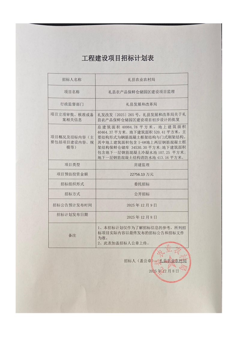 禮縣農(nóng)產(chǎn)品保鮮倉(cāng)儲(chǔ)園區(qū)建設(shè)項(xiàng)目監(jiān)理